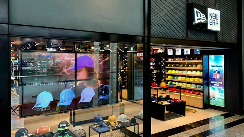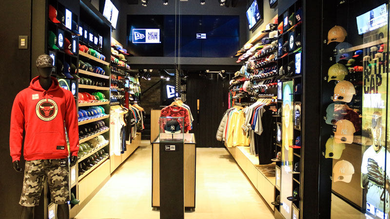 As lojas no Brasil oferecem a linha completa de bonés, vestuário e acessórios, trazendo ao consumidor o espírito dos campos, quadras, moda de rua, palcos e vitrines.